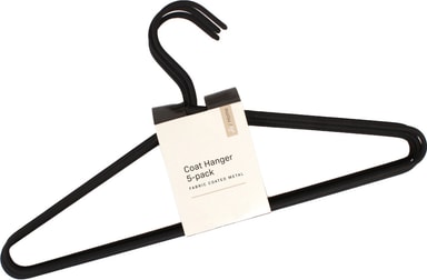 A Home kleshengere har en minimalistisk, rett metallramme trukket med stoff for et elegant, ensartet utseende. Den nøytrale sorte finishen passer enkelt inn i enhver garderobeløsning og tilbyr både funksjonalitet og subtil stil.