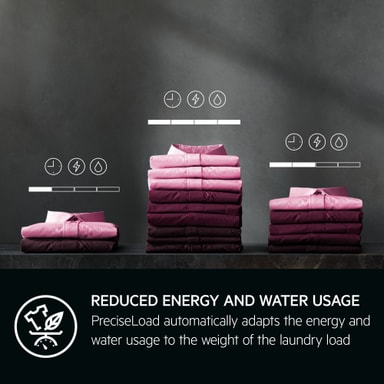 PreciseLoad tilpasser automatisk syklustiden i tillegg til strøm- og vannforbruk i henhold til størrelsen på vasken. Dermed får du tilpassede vaskesykluser som reduserer strøm- og vannforbruket når du vasker og tørker mindre mengder.