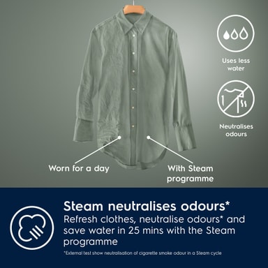 Gled deg over følelsen av nyvasket tøy med en brøkdel av vannbehovet. Ved å friske opp klærne dine med damp, kan du nøytralisere luktene* og redusere skrukker på 25 minutter. For enda mer friskhet, tilfør vår damp-duft i dampprogrammet.