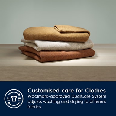 DualCare-system justerer vasking og tørking til ulike stoffer og justerer tørketrommelens bevegelse i tørkesyklusen. Vaske- og tørkesykluser for ull er blitt godkjent av Woolmark Company for vasking og tørking til og med av ullplagg som kun skal håndvaskes.