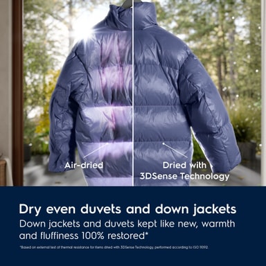 3DSense-teknologi, vår unike teknologi skanner fuktigheten i plagg, for presis og fullstendig tørking. Selv de tykkeste plagg som dyner og dunjakker tørkes jevn og beskyttes, og forblir luftige og holder på varmen.