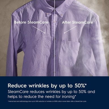 SteamCare-funksjon bidrar til å nøytralisere lukt og reduserer krøller med opptil 50 %. Mindre krøller på plaggene dine reduserer behovet for stryking, og gjør at klærne varer lenger. *Intern test og metodologi viser opptil 50 % reduksjon av krøller på 100 % vevd bomullsstoff etter en syklus med SteamCare.