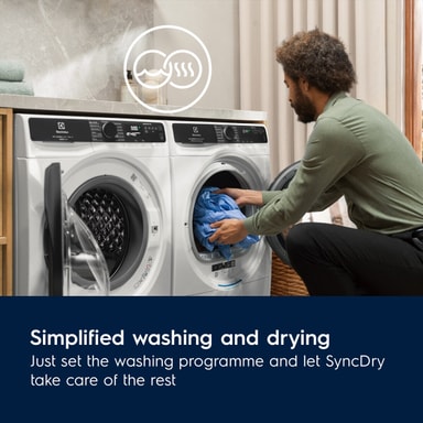 SmartSelect er din alt-i-ett intuitive klesvaskassistent. Den lar deg raskt velge den ønskede tørrheten mens grønt blad-symbolet gir tilbakemelding om energiforbruket. Med en tilkoblet vaskemaskin og tørketrommel fra Electrolux, lar SyncDry deg pare tørketrommelinnstillingen din i henhold til den tidligere vaskesyklusen for enkel bruk. Du kan til og med samhandle eksternt med tørketrommelen via Fjernstart-funksjonen for å enkelt gjøre justeringer.