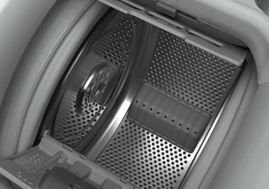 Enkel fylling og tømming av klesvasken med Soft Opening-systemet. Trykknappdeksel og myk innvendig trommeldør sørger for enkel og trygg tilgang til klærne. Og fordi åpningen er øverst kan du tydelig se innholdet.