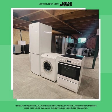 Trenger du tre solide hvitevarer uten å bruke tid på å velge? Vi i Norsk Ombruk setter sammen en ferdig pakke med kombiskap, vaskemaskin og komfyr — nøye testet, rengjort og klargjort med 2 års garanti.