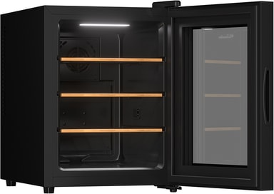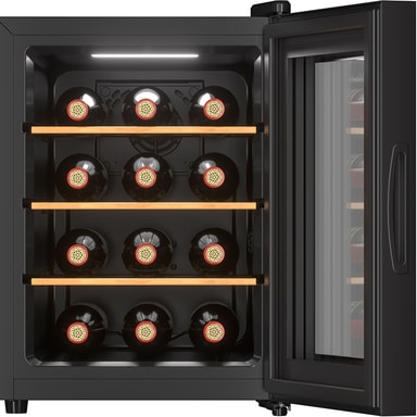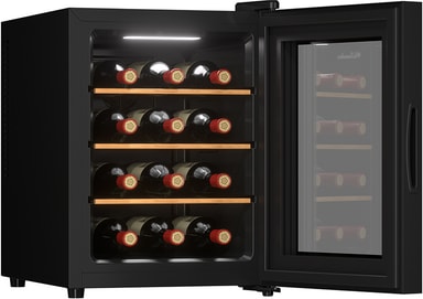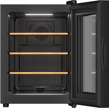Dette frittstående vinlagringsskapet har en elegant sort finish med integrerte håndtak som kombinerer stil og funksjonalitet. Det har også justerbare føtter slik at det enkelt kan tilpasses interiøret ditt.