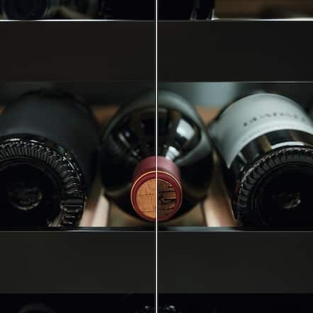 En glassdør med UV-beskyttelse samt UV-fritt LED-lys i vinskapet gir optimale lagringsforhold for din vinsamling. Naturlig lys kan påvirke de verdifulle innholdsstoffene i vinen. Vårt spesialfargede glass hindrer slike uønskede reaksjoner. Dermed kan du presentere dine viner under optimale lagringsforhold, og det over lengre tid – uten å måtte gå på kompromiss med kvalitet eller smak.