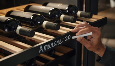 På hver trehylle er det festet en list, som kan skrives på med kritt eller fargestifter for å gi deg en optimal oversikt: Her kan du f.eks. skrive opprinnelse, druesort eller årgang for en vin. Hvert NoteBoard kan tas av for enkel merking.