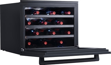 Apparatet kommer med tre elegante trehyller som har plass for opptil 24 vinflasker.