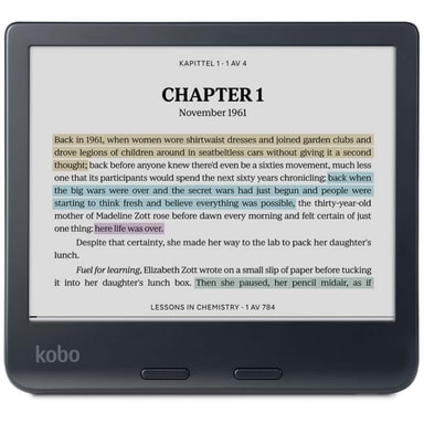 Med kompakte og stilige Kobo Libra Colour eBook-leser har du alltid med deg alle favorittbøkene dine. E-boken på 7 tommer har en ny Kaleido 3-fargeskjerm med E-ink og gode optiske egenskaper. Skjermen gir deg høy kontrast, skarphet og rask responstid. Opplev et helt nytt nivå av lesekomfort med den adaptive ComfortLight PRO-funksjonen, en teknologi som hjelper deg med å justere skjermens lysstyrke og fargetone. Det moderne og elegante designet er lett å håndtere, og den har et 2050 mAh-batteri med lang levetid som kan vare i opptil 40 dager. Synkroniser alle e-bøkene dine enkelt takket være WiFi-tilkoblingen, og lytt til bøkene dine ved hjelp av Bluetooth-tilkoblingen som lar deg lytte hvor som helst.