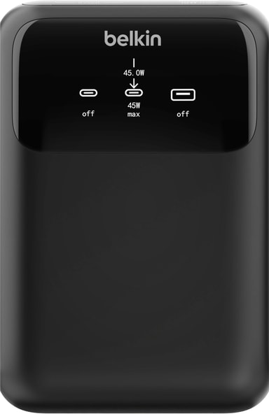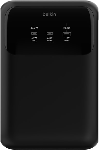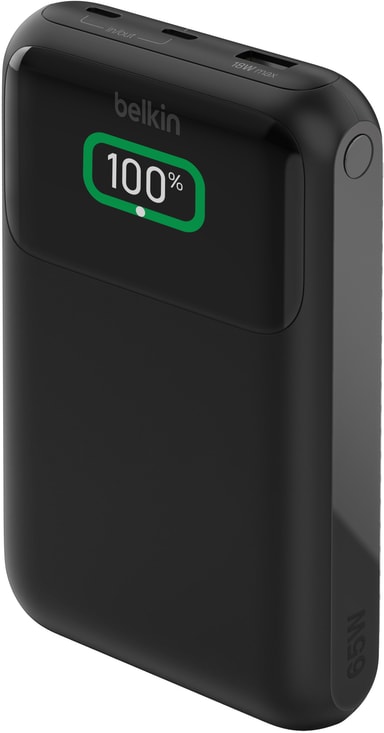 Belkin BoostCharge Pro 20K powerbank for bærbar PC er designet for å holde deg ladet mens du er på farten. Med en betydelig batterikapasitet på 20 000 mAh kan den lade opp enhetene dine flere ganger og gir en total ladehastighet på opptil 65W. Denne powerbanken har én USB-A-port og to USB-C-porter, slik at du kan lade laptopen din og to andre enheter samtidig for en rask og praktisk ladeopplevelse. I tillegg holder den fargede digitale skjermen deg oppdatert på batteristatus.