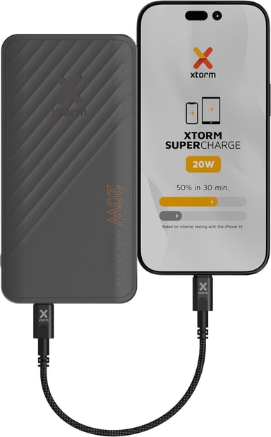 Xtorm 20W SuperCharge 20 000 mAh powerbank leverer hurtiglading med doble USB-A- og USB-C-porter, og lader enheter 4+ ganger, alt i et kompakt design som er perfekt for reiser og kompatibelt med alle smarttelefoner.Les mer om produktet