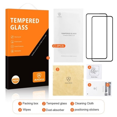 pakken inkluderer: 2 x AMORUS Skjermbeskytter i herdet glass 2 x rengjøringsklut 2 x alkoholforberedelsespute 2 x støvabsorberer 4 x kun tilbehør til veiledningsklistremerke, telefon ikke inkludert