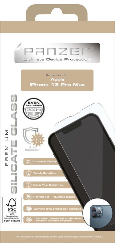 Sørg for at skjermen til din iPhone 13 Pro Max er ripefri og ren med Panzer Full-Fit skjermbeskytter. Den er laget i ekte silikatglass som tåler en trøkk. Tykkelsen på bare 0,33 mm gjør at beskyttelsen er nærmest usynlig.Les mer om produktet