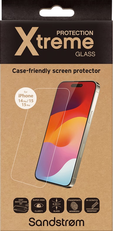 • Sandstrøm iPhone 14 Pro/15/15 Pro/16 Flat Glass skjermbeskytter