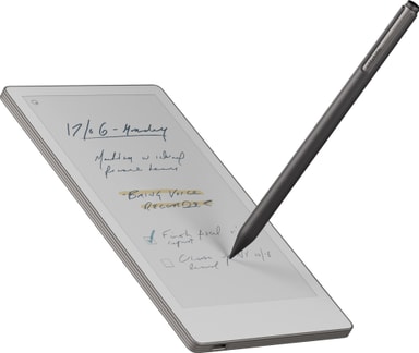 reMarkable Paper Pro Move E-ink tablet + Marker Pluskombinerer den taktile følelsen av papir med fordelene ved digital teknologi, noe som gjør den til et utmerket valg for fagfolk som verdsetter fokusert produktivitet. Enheten tilbyr funksjoner som konvertering fra håndskrift til tekst og skysynkronisering, som sikrer at notatene dine er organiserte og tilgjengelige når som helst. Med den medfølgende Marker Plus kan du nyte en naturlig og intuitiv skriveopplevelse, og den inkluderte Leather Book Folio beskytter din reMarkable Paper Pro Move på en stilfull måte.