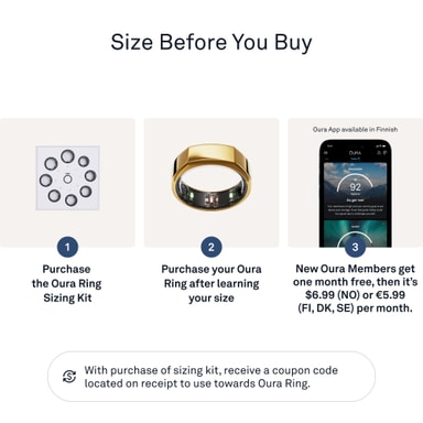 Oura-ringen følger ikke standardstørrelser, så det er avgjørende å finne den perfekte passformen for å få en optimal opplevelse. Takket være størrelsessettet kan du finne den perfekte størrelsen for deg. Når du kjøper et størrelsessett, får du et gavekort som du kan bruke til å kjøpe en Oura-ring.
