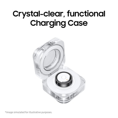 Selv når den lades i det krystallklare ladeetuiet, er Galaxy Ring et syn for øyet. Det delikate lyset rundt multifunksjonsknappen indikerer batteriets ladingsnivå. Ladeetuiet kan også lades trådløst, slik at du enkelt kan plassere Galaxy Ring sikkert i etuiet når du er på farten, og deretter legge det på en trådløs ladeplate for enkel lading.