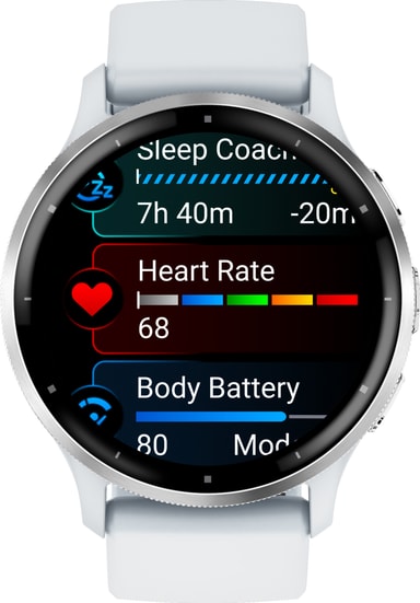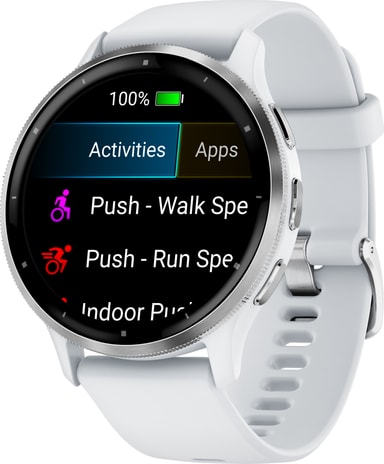 Smartklokken kan registrere løping, sykling, tredemølle, ellipsemaskin, kondisjonstrening, yoga og andre aktiviteter. Den er også svømmesikker og tåler 5ATM vann, slik at du fortsatt kan bruke den i bassenget eller dusjen. Med Body Battery Monitor kan du se kroppens energinivå, slik at du vet når du er klar for aktivitet. Venu 3 har også en rullestolmodus som sporer skyvebevegelser og tilbyr forhåndsinnlastede treningsøkter som er tilpasset rullestolbrukere. Takket være den kostnadsfrie smartappen Garmin Coach kan du få personlige treningsplaner.