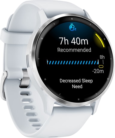 Venu 3 har integrerte GPS-posisjonstjenester som måler avstand og tempo med bemerkelsesverdig nøyaktighet, selv innendørs. Du kan følge med på aktiviteten selv etter trening. Smartklokken teller skritt, løping, sykling og kan varsle deg hvis du sitter lenger enn én time.