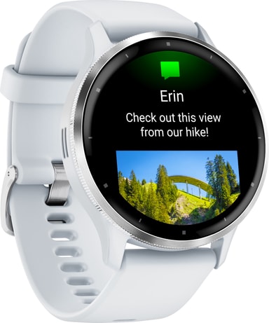 Venu 3 har mange funksjoner når den er koblet til smarttelefonen din. Takket være Bluetooth-tilkoblingen kan du enkelt besvare telefonsamtaler, se nye varsler og bytte mellom sanger. Når du er koblet til en Android-enhet, kan du dessuten svare på meldinger via et skjermtastatur og enkelt se innkommende bilder. I tillegg kan du enkelt laste opp data fra smartklokken og se fremgangen i treningsøkten på den store skjermen.