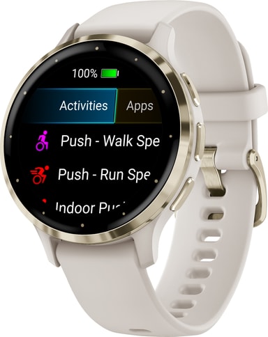 Smartklokken kan registrere løping, sykling, tredemølle, ellipsemaskin, kondisjonstrening, yoga og andre aktiviteter. Den er også svømmesikker og tåler 5ATM vann, slik at du fortsatt kan bruke den i bassenget eller dusjen. Med Body Battery Monitor kan du se kroppens energinivå, slik at du vet når du er klar for aktivitet. Venu 3S har også en rullestolmodus som sporer skyvebevegelser og tilbyr forhåndsinnlastede treningsøkter som er tilpasset rullestolbrukere. Takket være den kostnadsfrie smartappen Garmin Coach kan du få personlige treningsplaner.