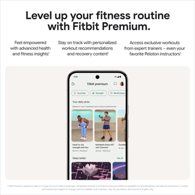 1 Noen funksjoner krever Fitbit-mobilappen og/eller Fitbit Premium-abonnement. Premium-innhold og -funksjoner kan endres, kan variere fra enhet til enhet, er ikke tilgjengelige i alle land og finnes kanskje bare på engelsk.