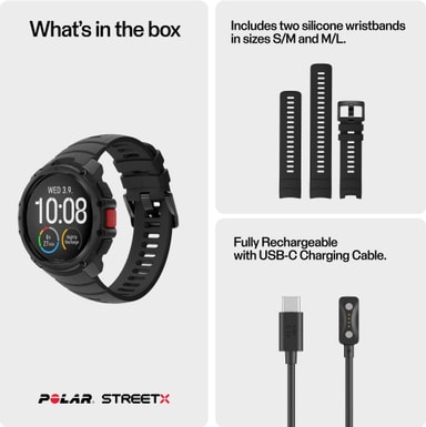 Polar Street X sportsklokke S-L kombinerer et varig design med en 1,28" Gorilla Glass 3 AMOLED-skjerm, klargjorte treningsplaner, Precision Prime ™ Optical pulssporing, og innebygd GPS med barometer.Les mer om produktet