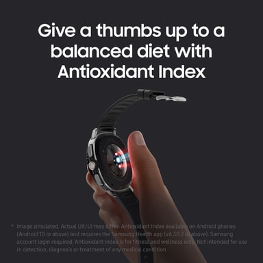 *Antioksidantindeks tilgjengelig på Android-telefoner (Android 10 eller senere) og krever Samsung Health-appen (v6.30.2 eller senere). Innlogging på Samsung Account kreves. Antioksidantindeksen er kun for fitness og velvære. Ikke ment for bruk ved oppdagelse, diagnose eller behandling av noen medisinsk tilstand. Vennligst konsulter en medisinsk profesjonell for råd hvis du er bekymret for antioksidantnivået ditt.