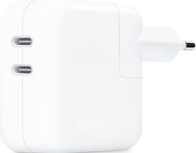 Opplev hurtiglading med Apple 35W Dual USB-C strømadapter, som gir opptil 35 watts effekt. Minimer dødtid, og sikre at du alltid er klar til å være med på det som skjer.