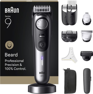 Braun Series 9 skjeggtrimmer består av fire kammer, tre tilbehør, og en skjegg-sjablong for presis frisering. En ladedokk, bag, og reisedeksel gjør det lett å ta med seg, mens rengjøringsbørsten sikrer enkelt vedlikehold.