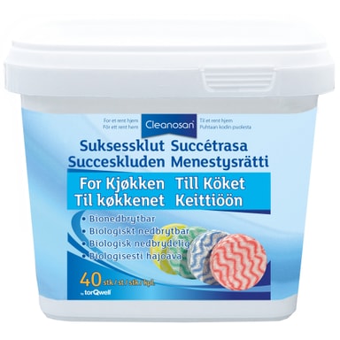 Pakke med 40 universelle chiffonkluter fra Cleanosan. Klutene utvider seg når de kommer i kontakt med vann og er biologisk nedbrytbare.Les mer om produktet