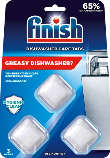 Finish rensetabletter (3 stk.) 3075545 hjelper deg med å løse opp fett og skitt i oppvaskmaskinen, inkludert i filteret og spylearmen. Bruk en tablett en gang i måneden samtidig som du skal vaske opp for å spare vann. Virker best med "All in One"-tabletter.