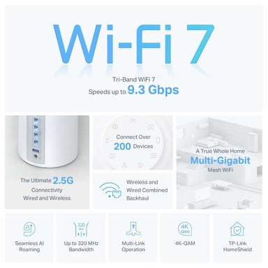 Utstyrt med de nyeste Wi-Fi 7-funksjonene, inkludert 320 MHz-kanaler, 4K-QAM og 6 GHz-båndet, sikrer dette systemet et nettverk med eksepsjonell ytelse og pålitelighet.