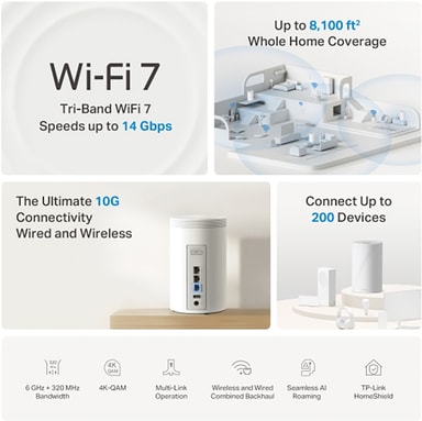 TP-Link Deco BE68 Wi-Fi 7 mesh system er perfekt for den moderne digitale livsstil. Med 8-strøms tri-band Wi-Fi, samtidig kablet og trådløs backhaul og avansert trafikkhåndtering, takler det uten problemer krevende multitasking som 8K-streaming, konkurransepreget gaming, sikkerhetskopiering til skyen og smarthus-økosystemer.