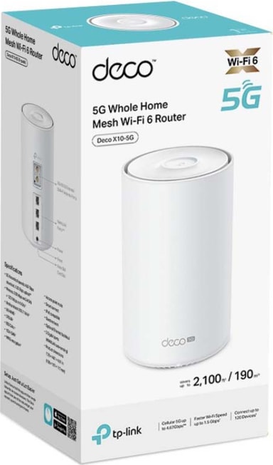 TP-Link Deco X10 WF6/AX1500 5G mesh-ruter leverer 5G-tilkobling, 1 ms ventetid, tobånds Wi-Fi 6 og sømløs mesh-dekning for opptil 120 enheter, alt med enkel plug-and-play-oppsett og robust sikkerhet.Les mer om produktet