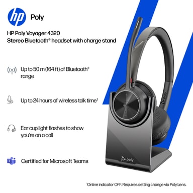 HP Poly Voyager 4320 MS Teams headset USB-A kabel med ladestativ sikrer at du blir hørt klart og tydelig. Headsettet har mikrofon med Acoustic Fence-teknologi, tilkobling via Bluetooth og USB-adapter og lang batterilevetid.Les mer om produktet