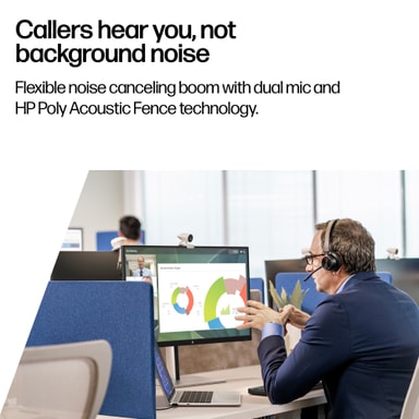 Hør kollegene dine klart og tydelig takket være de store 32 mm-elementene som gir en kraftig lyd. Mikrofonen sørger for at du blir hørt uten forstyrrelser takket være Acoustic Fence-teknologien, som reduserer bakgrunnsstøy og samtaler.