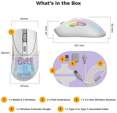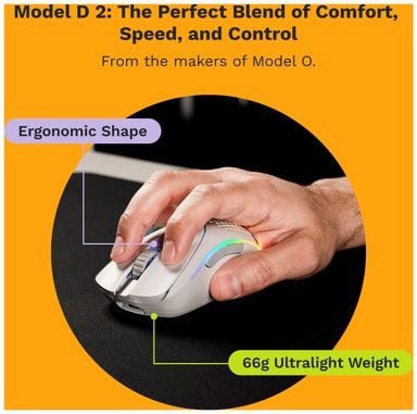 Med en vekt på bare 66 gram er Model D 2 utrolig lett, noe som gir raske og presise bevegelser. Det lette designet minimerer belastningen på hendene, slik at spillere kan nyte lengre økter uten ubehag, samtidig som musens ergonomiske design er skreddersydd for å støtte både håndflate- og klogrep, noe som gjør den ideell for høyrehendte spillere med middels til store hender.