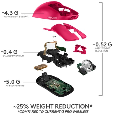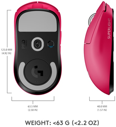 Logitech G Pro X Superlight trådløs gamingmus har mange av de same kvalitetene som G Pro-modellen, men er nesten 25 % lettere og veier kun 63 gram. Hero-sensoren med opptil 25 600 DPI-oppløsning, hastigheten på 400 tommer i sekundet, responstiden på 1 ms og designet anerkjent av profesjonelle er ivaretatt. Med det vil du ha alt som skal til for å klatre til topps på ledertavlen.