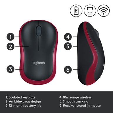 Den trådløse musen Logitech M185 har en kompakt, avrundet form som fint får plass i reisevesken. Musen kan brukes med begge hender og kobles til med en knøttliten Nano-USB-mottaker til din USB-port, uten å ta opp for mye plass. Musen har opptil ett års batterilevetid, slik at du ikke trenger å byttebatteri til stadighet.