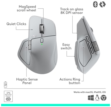 (8) Sammenlignet med MX Master 3 har MX Master 4 venstre- og høyreklikk med 90% mindre lydstyrkenivå.