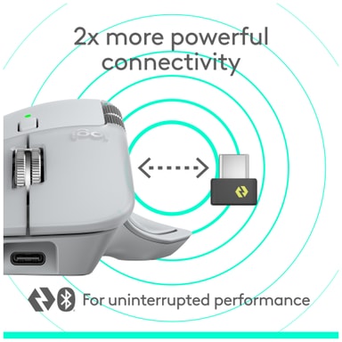 Nyt uavbrutt ytelse med MX Master 4s kraftige tilkoblingsmuligheter. Velg mellom den medfølgende USB-C-dongelen for en sterkere, raskere tilkobling eller Bluetooth for allsidighet. Den avanserte radiobrikken og optimaliserte antenneplasseringen sikrer en pålitelig forbindelse til datamaskinen din. Med opptil 70 dagers batterilevetid på én lading kan du jobbe i lengre perioder uten å bekymre deg for strøm.