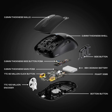 Designet for maraton-gaming veier denne musen bare 52 gram, noe som minimerer belastning og maksimerer komfort under langvarig spilling. Det ergonomiske, ambidekstrale designet gir enkel håndtering for både venstre- og høyrehendte. De høykvalitets TTC Golden Dusk Proof-bryterne for venstre og høyre hovedklikk har en levetid på 60 millioner klikk, og en TTC-enkoder med 100 millioner trinn.