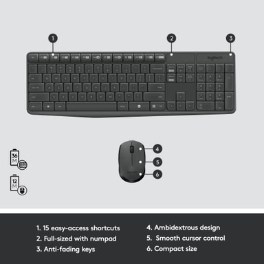 Gjør det minimalistisk og enkelt med Logitech MK235 sett med tastatur og mus. Med trådløs tilkobling unngår du irriterende kabelkrøll og holder skrivebordet ditt rent og pent. Jobb raskt og effektivt med et tradisjonelt tastaturoppsett med behagelige lavprofilstaster og en mus som kan brukes både med høyre og venstre hånd.