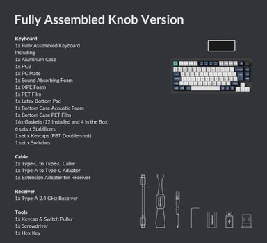 Det slanke, CNC-behandlede aluminiumshuset utstråler en førsteklasses følelse, mens det doble pakningsdesignet, flere lag med akustisk skum og PCB-stabilisatorer gir en stillegående og komfortabel skriveopplevelse. Kombinert med double-shot PBT-tastehus for god oljebestandighet, holdbarhet og langvarig bruk. Med bryterne som kan skiftes ut i løpet av kort tid, kan du tilpasse skriveopplevelsen uten å måtte lodde — det er bare å sette inn nye brytere, så er du klar. Tastaturet er kompatibelt med nesten alle 3- og 5-pinners MX-brytere. Det fullt tilpassbare tastaturet kan enkelt demonteres, tilpasses og justeres slik at det passer til din skriveopplevelse.