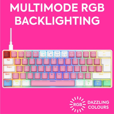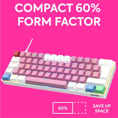 NOS C-450 Mini PRO RGB gamingtastatur tar opp mindre plass på pulten enn ordinære tastatur, uten at det går på kompromiss med gamingytelsen. Det har kun 62 taster, og rammen har et kompakt og plassbesparende design. Videre kan tastaturet skilte med mekaniske røde Outemu-brytere og RGB-lys hvor du kan velge blant 18 forhåndsprogrammerte mønstre for å matche resten av oppsettet ditt. Du kan også la lysene gå i én bestemt farge.
