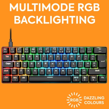 NOS C-450 Mini PRO RGB gamingtastatur tar opp mindre plass på pulten enn ordinære tastatur, uten at det går på kompromiss med gamingytelsen. Det har kun 62 taster, og rammen har et kompakt og plassbesparende design. Videre kan tastaturet skilte med mekaniske røde Outemu-brytere og RGB-lys hvor du kan velge blant 18 forhåndsprogrammerte mønstre for å matche resten av oppsettet ditt. Du kan også la lysene gå i én bestemt farge.