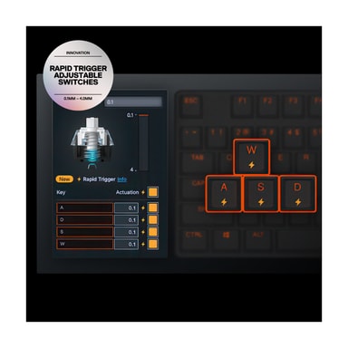 Få nøyaktig tilbakemelding og raskere responstid med OmniPoint 3.0 justerbare Hyper Magnetic-brytere, som har en Rapid trigger-modus som umiddelbart tilbakestiller tastene for redusert oppadgående bevegelse slik at du får raskere input. Du kan stille inn hvor langt ned du må trykke en tast for at den skal registreres, fra en hårtrigger på 0,1 mm for hastighet i spill til et dypere trykk på rundt 4,0 mm for nøyaktighet ved skriving.