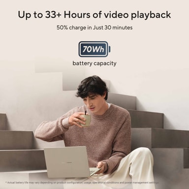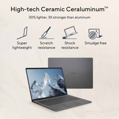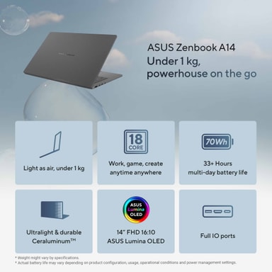 Laget med et ceraluminum-chassis, er Zenbook A14 både lett og holdbar, veier bare 0,99 kg og måler bare 1,34 cm i høyden. Den er designet for mobilitet, med batteri som varer opptil 33 timer og støtter hurtiglading, slik at du holder deg ladet gjennom hele dagen.